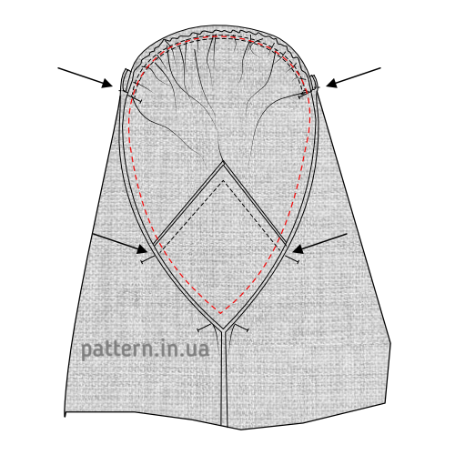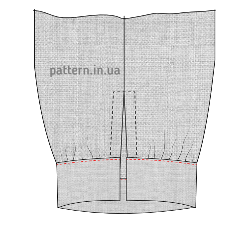 9. Відігнути наверх залишений 1 см ластовиці, скласти бічні сторони рукава, поєднуючи надсічки. Зшити рукав від ластовиці до надсічки по низу рукава