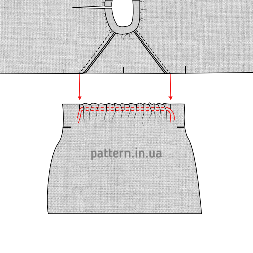 7. По верху рукава прокласти 2 рядки широким стібком між крайніми надсічками і стягнути до ширини уставки